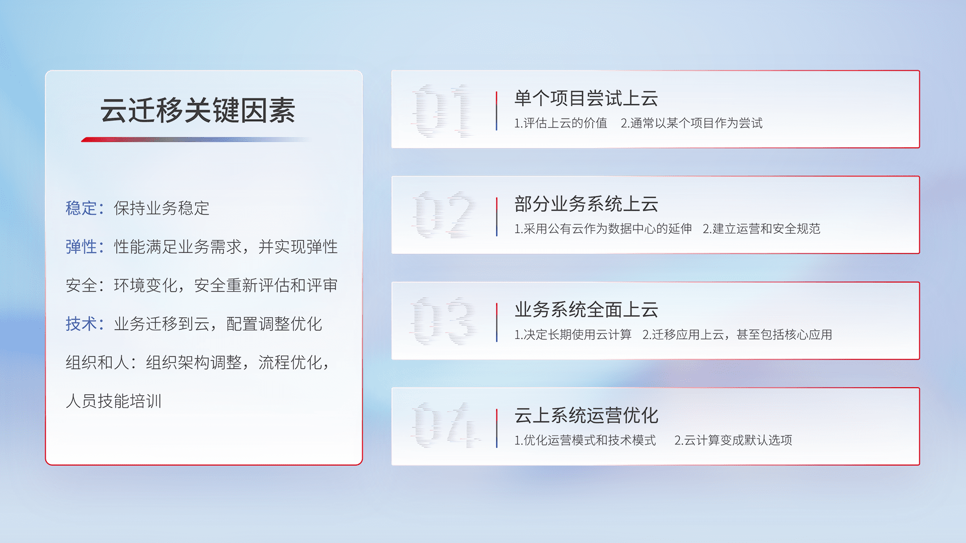结合实际业务,,从规划设计、、、云平台选型、、、云原生改造、、、、数据迁移、、、、集成交付,,,,迁移全过程为客户识别最佳上云路径,,做好风险识别管理,,,,设计网络架构、、身份权限、、、、安全审计合规、、操作审计、、、、日志审计、、、监控告警策略、、、、多站点容灾设计等,,对云上基础设施进行整体规划,,,,提升IT治理水平,,,,以满足弹性、、、、高可用、、、高性能的需求。。。。