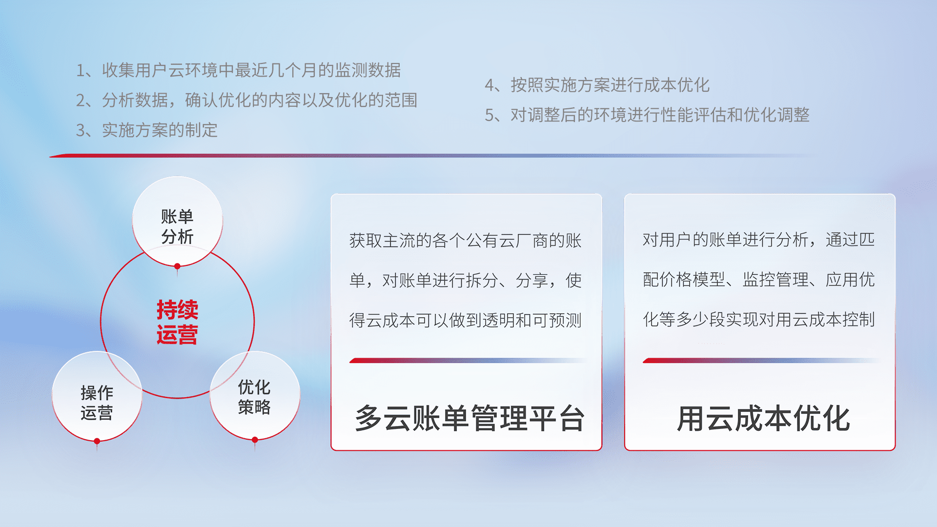 通过多云纳管,,以统一的资源数据模型把客户的云资源进行抽象和封装,,进而实现对多云资源的统一操作,,保障云资源管理的可靠性、、、稳定性与可用性。。量身定制化运维内容,,配置、、开发运维、、、补丁管理、、、、备份、、、监控、、认证和访问管理、、、、审计和日常巡检等,,,保障在用云过程中的可靠度,,稳定度以及高可用率。。。。